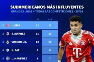 体育资讯10月24日讯 德国转会市场统计了本赛季五大联赛南美球员的参与进球数量,并列出榜单,路易斯-迪亚斯参与11球居首,阿尔瓦雷斯、维尼修斯参与10球次席。